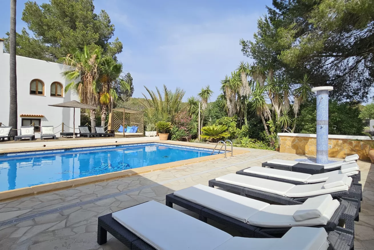 The private swimming pool is perfect for relaxing under the Ibiza sun, while the outdoor lounge areas invite guests to slow down and enjoy the island’s atmosphere.