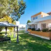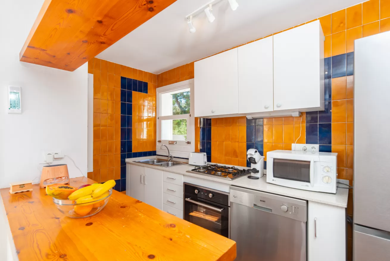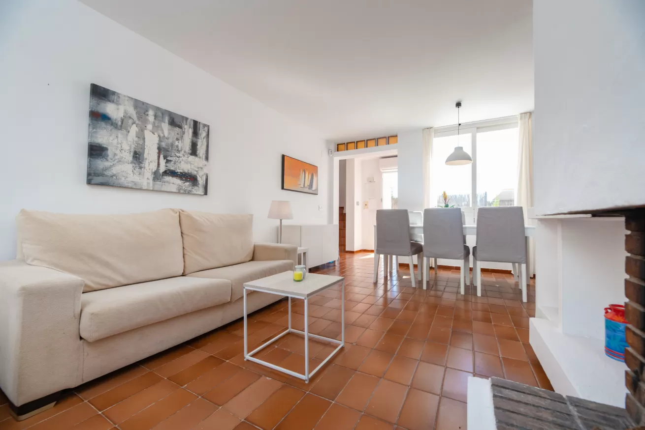 The house features 3 bedrooms and 2 bathrooms, air conditioning and spacious, bright interiors. The design combines warm tones with a Mediterranean style that invites relaxation. There is a large living room with a fireplace, perfect for spending time together at any time of the year, and a fully equipped kitchen with an oven, dishwasher, microwave, washing machine, and all the necessary utensils for a carefree stay.