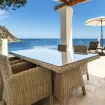 Questa villa si erge imponente sulla costa rocciosa di Cala Llonga, nella parte orientale dell’isola, offrendo una vista panoramica e totalizzante sul mare. L’affaccio in vetro che delimita il confine della zona piscina rende indefinito il confine tra la villa e l’orizzonte, conferendo alla casa un aspetto magico ineguagliabile.