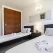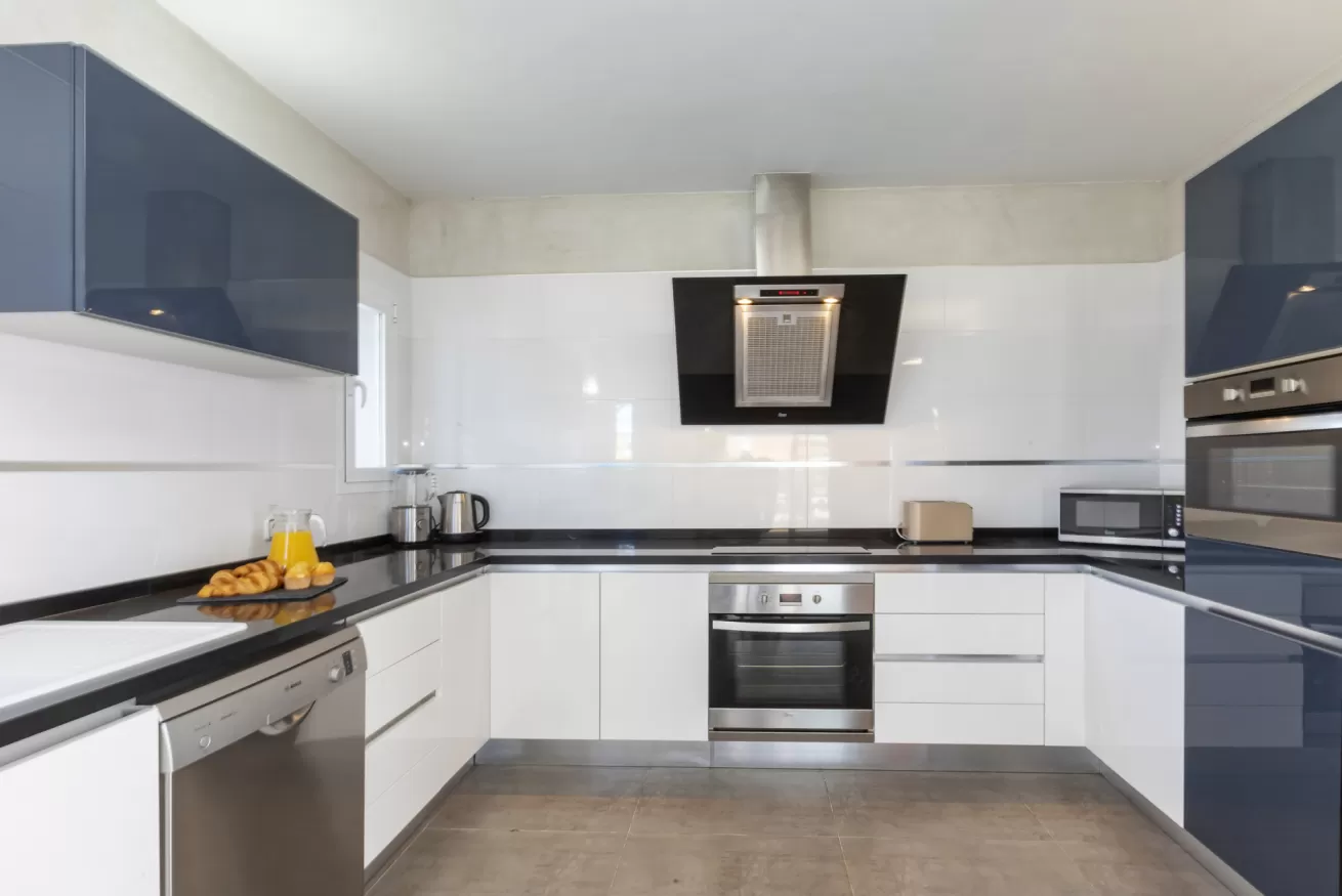 The interiors are spacious and bright, featuring a modern open-plan layout that combines the kitchen, dining area, and living room, creating a welcoming and sociable atmosphere. The kitchen is fully equipped with modern appliances, including a refrigerator, oven, dishwasher, and coffee machine, ensuring maximum comfort throughout your stay.
