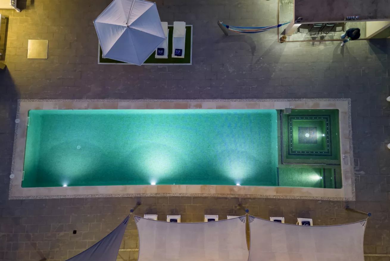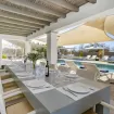 The outdoor areas are designed to fully embrace the island lifestyle: a spectacular 16-metre emerald-green swimming pool with an integrated jacuzzi invites you to cool off on warm summer days. Sun loungers, relaxing chill-out areas, a fully equipped outdoor kitchen, and a covered dining space provide the perfect setting for enjoyable gatherings while admiring the area’s famous sunsets.