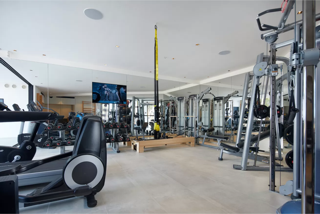 Professional gym with state-of-the-art equipment, including a Pilates Reformer Machine